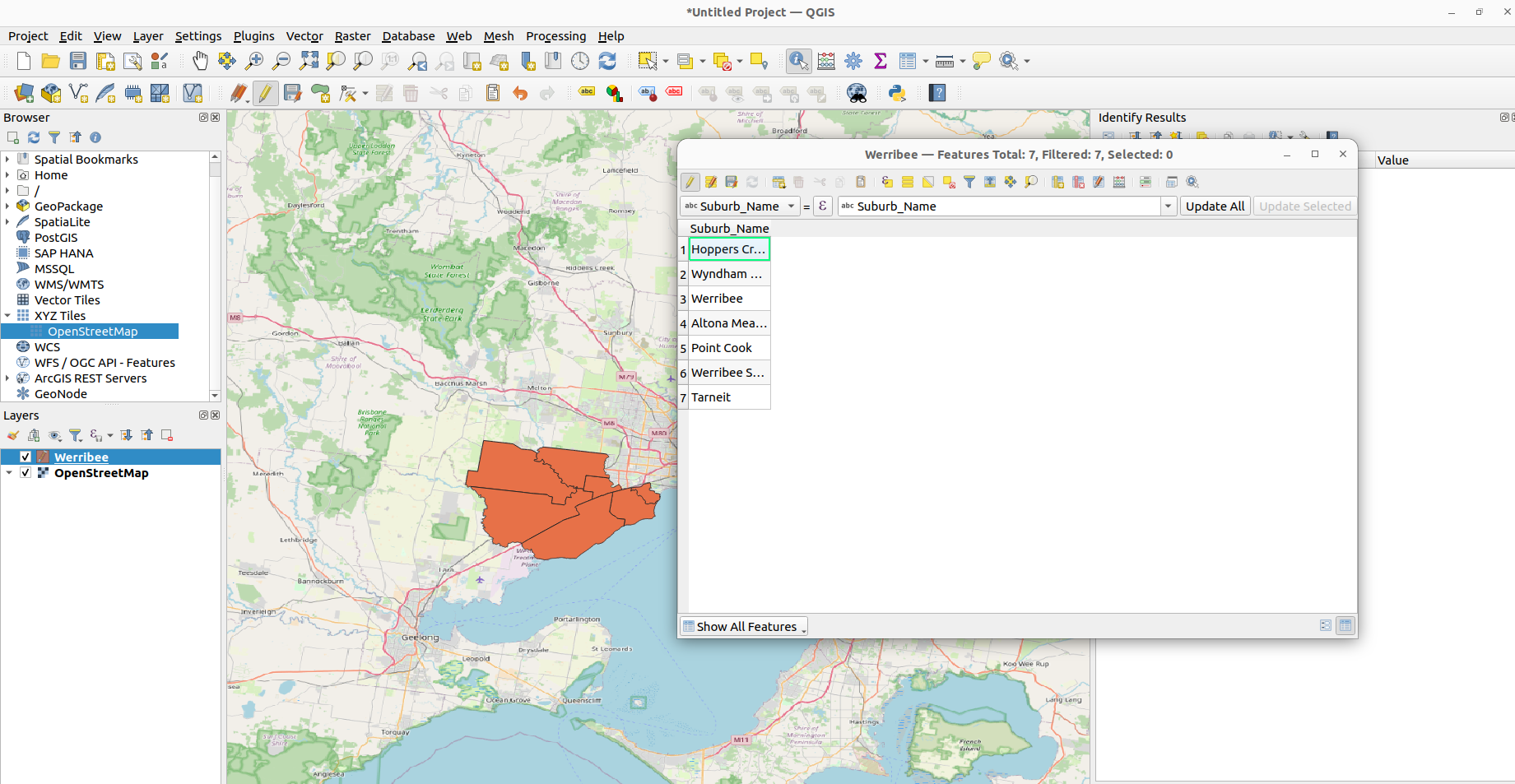 For instance, the shape file Werribee.geojson has an attribute called Suburb_Name: